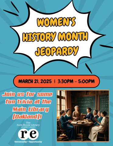 Let's celebrate Women's History Month! Join us at the Main Library on March 21st, from 3:30 - 5:00, for a fun game of Women's History inspired Jeopardy!